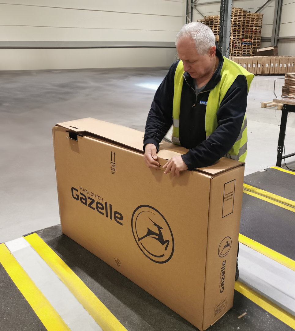 Wir verwenden ausschließlich vollständig recycelbare Verpackungen für die Fahrräder und Teile, die wir an Fahrradgeschäfte liefern. Darüber hinaus wurde eine neue Verpackungsmethode für den Transport von Gazelle E-Bikes in die Vereinigten Staaten entwickelt. Ab sofort werden die Fahrräder in einem "kleinen Karton" verpackt. Diese Änderung ermöglicht es uns, mehr Fahrräder in einen Container zu packen, was letztendlich umweltfreundlicher ist. Gemeinsam tragen wir dazu bei, den ökologischen Fußabdruck zu reduzieren und stellen sicher, dass unsere E-Bikes weltweit auf effiziente und umweltfreundliche Weise verteilt werden können.