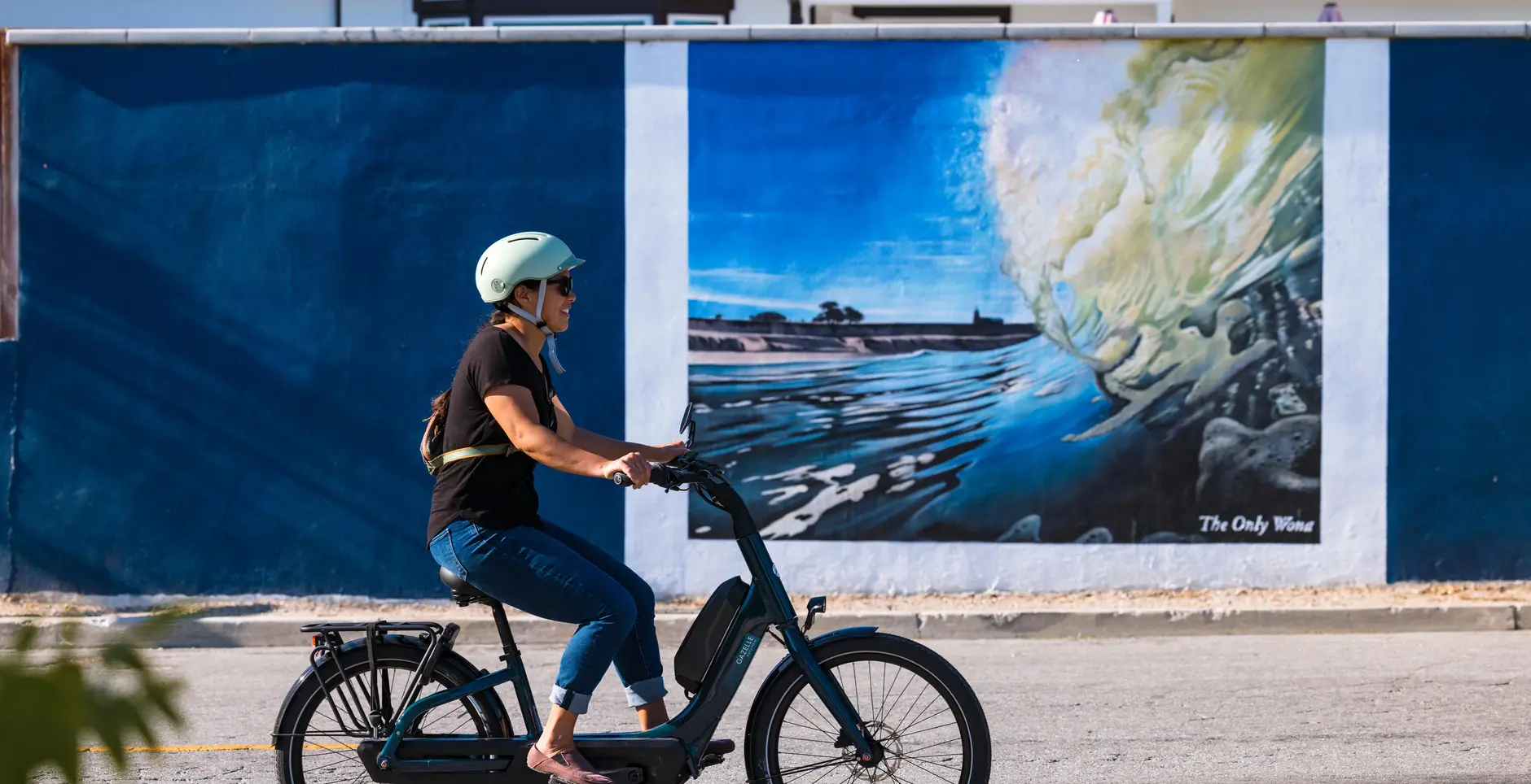 The Easyflow is all about accessibility and inclusivity to open up the possibility of biking to a broad range of riders. The Easyflow is uniquely accessible based on key features. In addition to the low, step-through frame, the bike's long wheelbase and short seat tube create a ride geometry and pedal-forward design, such that riders can have both feet flat on the ground while stopped while maintaining optimal leg extension while pedaling. This bike gives riders of all stripes confidence, control, and comfort.