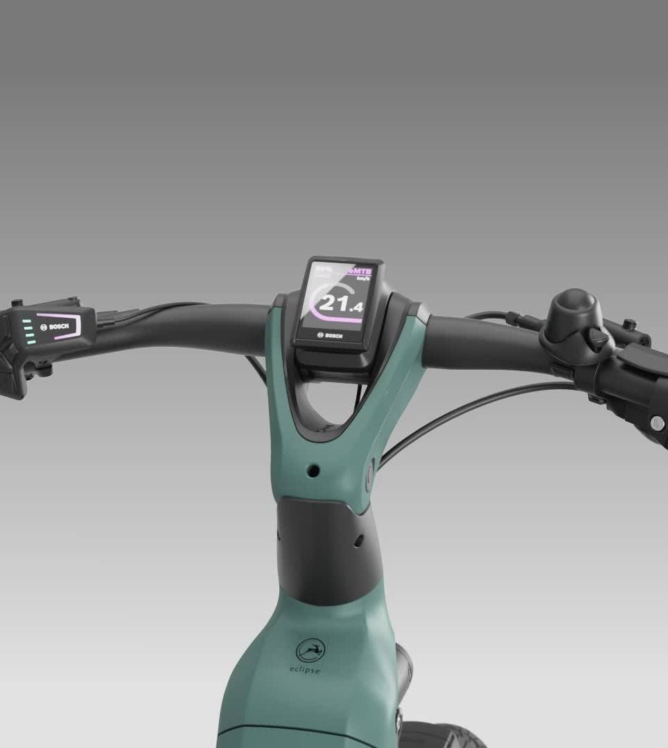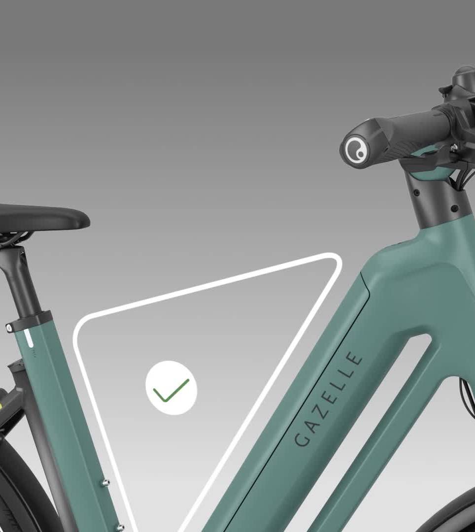 The iconic, single-coloured Gazelle V-shaped handlebar stem not only makes for a beautiful design, but also integrates the Bosch Kiox 300 display. The cables are also neatly tucked away in the headset.