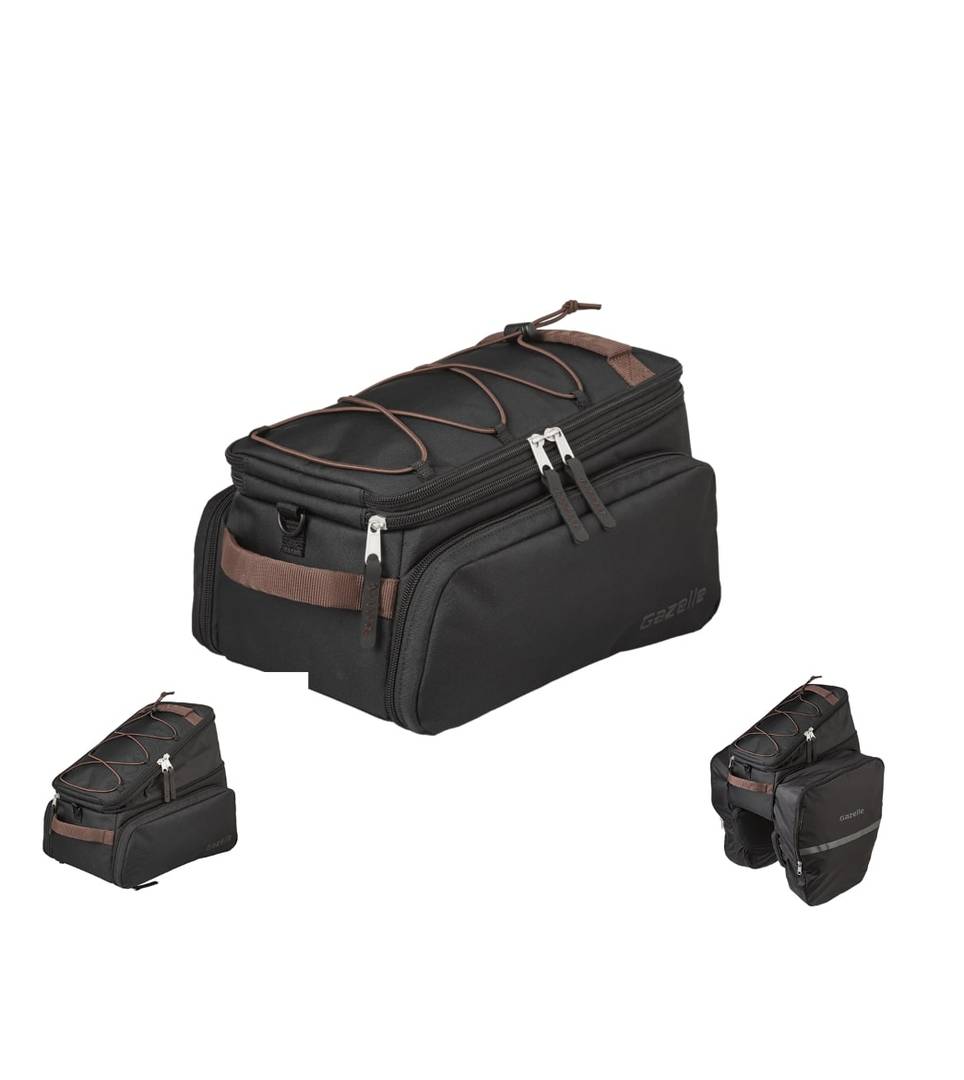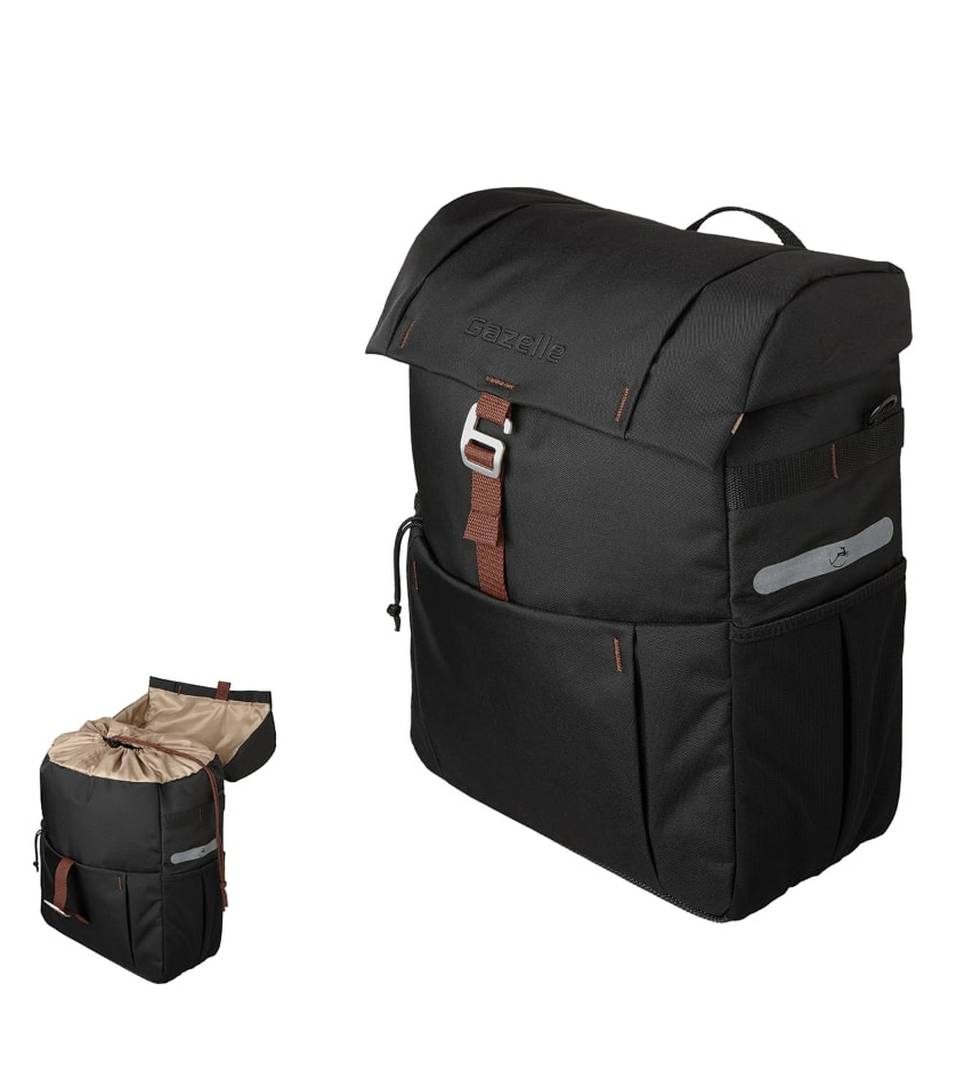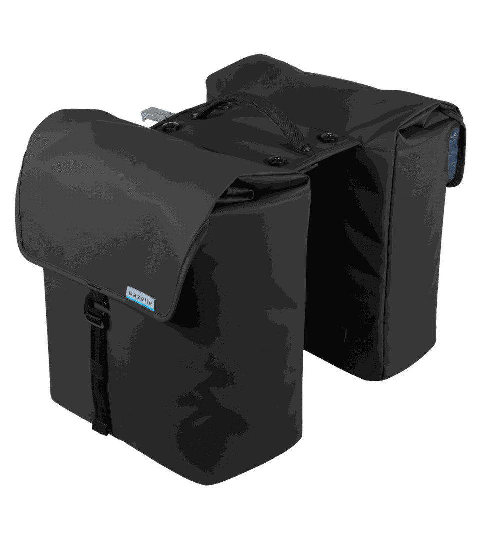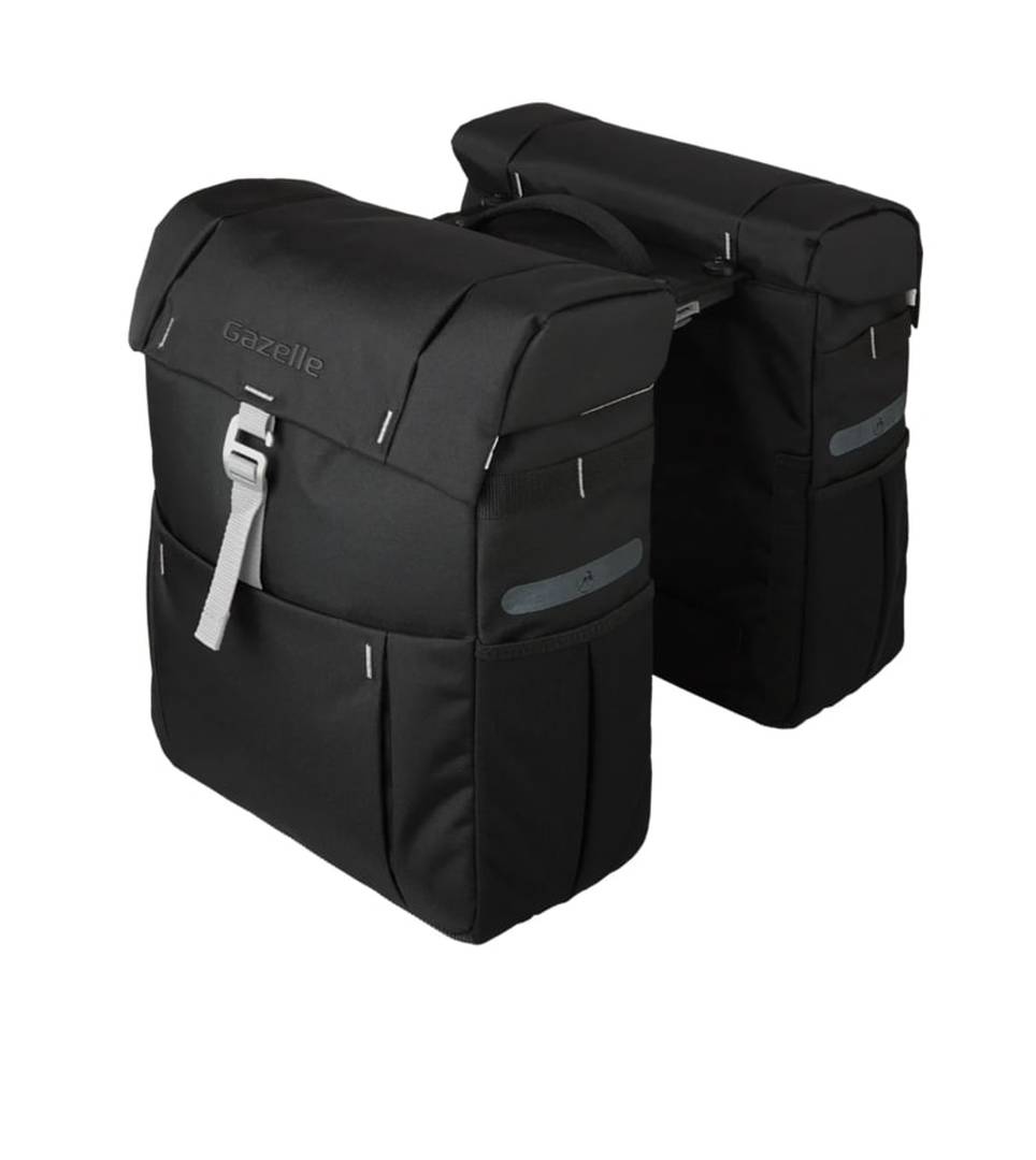 Complete your Gazelle with this modern bag design.The Gazelle Deluxe double bike bag is both sturdy and convenient to use and suitable for recreational and everyday use. With this bike bag, you'll never have to worry when you're on the move. The durable, water repellent fabric and reinforced side and bottom ensures that your valuables are always protected. Your journey will be extra safe, too, as the bag has reflective strips around it. The bag is easy to mount or replace with other accessories thanks to the MIK system.