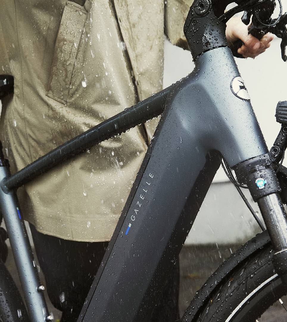 At Gazelle, our electric bikes are built to be water-resistant (also called splash-proof). That means they can handle normal rain conditions, though heavy downpours do call for a bit more caution. Rain that’s coming down hard may seep into tiny crevices and increase the risk of rust over time. So go ahead and keep riding, but use your best judgment in stormy weather.