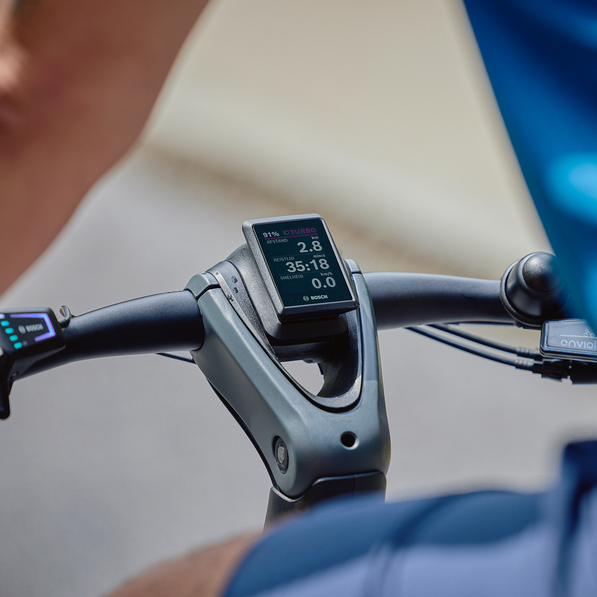 Het Purion zijdisplay van Bosch is makkelijk en veilig te bedienen met de duim links aan het stuur. Het display en de bediening zitten samen in één apparaat. Met de eenvoudig te bedienen toetsen kunnen de ondersteunende fasen ingesteld worden (Off, Eco, Tour, Sport, Turbo). Het display kan vanuit elke hoek optimaal afgelezen worden en informeer je over de snelheid, totaal aantal kilometers, reikwijdte en afstand.